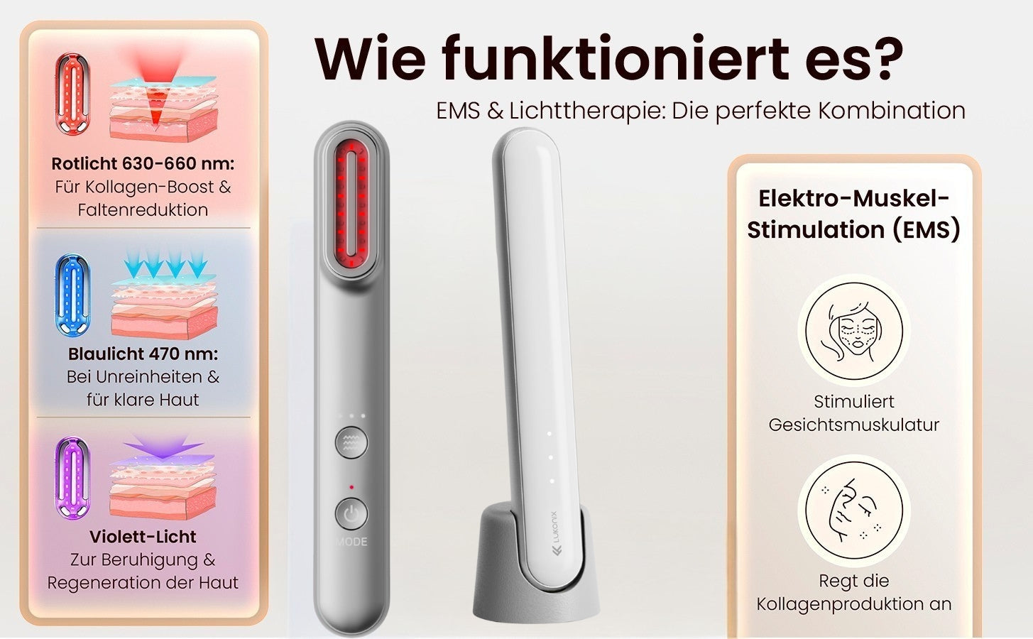 Die Lukonix 5-in-1 LED Lichttherapie mit Standfuss vereint modernste Technologie mit einer gezielten, effektiven Hautbehandlung. Drei unterschiedliche Lichtfarben – Rot, Blau und Violett – wirken auf verschiedene Hautbedürfnisse und unterstützen deine Haut dort, wo sie es am meisten braucht.