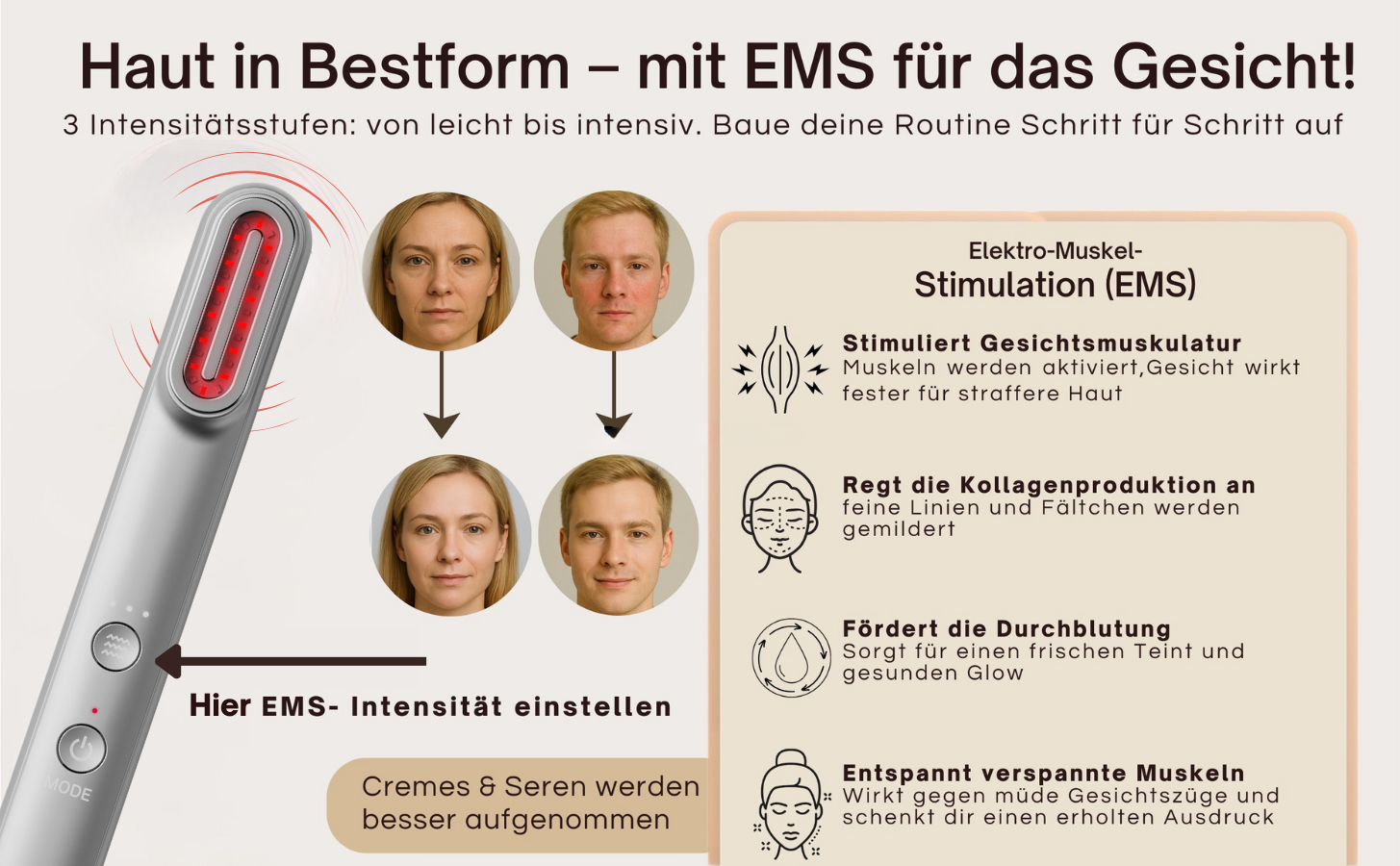 Zusätzlich sorgt EMS-Mikrostrom für eine sanfte Aktivierung der Gesichtsmuskulatur und hilft, die Haut zu straffen. Feine Vibrationen fördern die Mikrozirkulation und unterstützen die Aufnahme deiner Pflegeprodukte – für maximale Wirkstofftiefe. Die integrierte Wärmefunktion entspannt die Haut und rundet das Wellnesserlebnis ab.