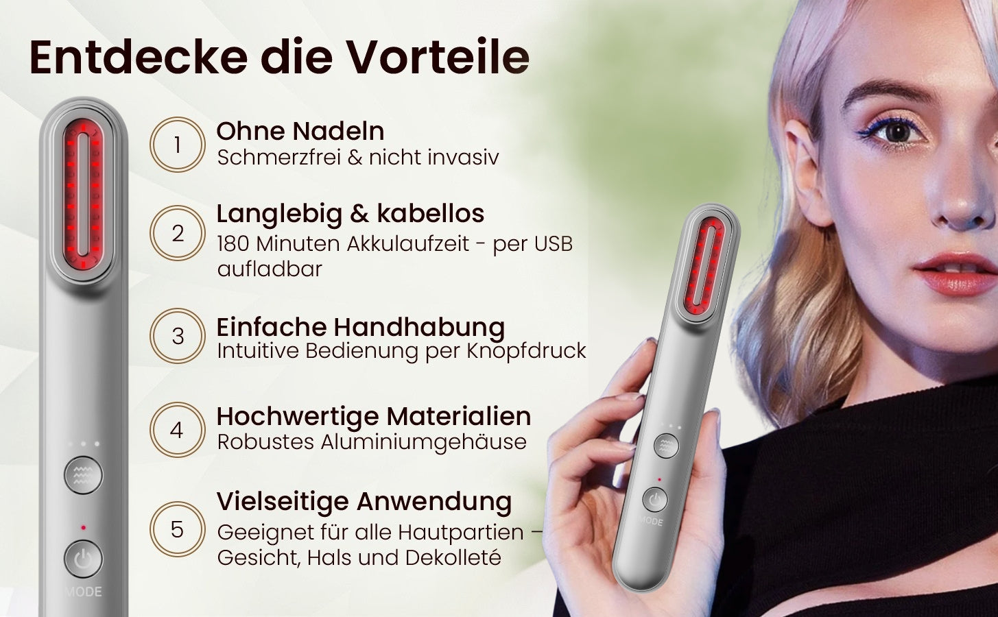 Straffere Haut ohne Nadeln: Die intelligente Kombination aus EMS-Mikrostrom und 3-Farben-Lichttherapie (Rot, Blau, Violett) aktiviert die Zellen tiefenwirksam, fördert die Kollagenproduktion und beruhigt das Hautbild.