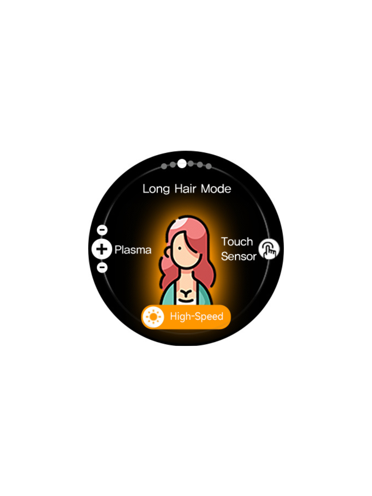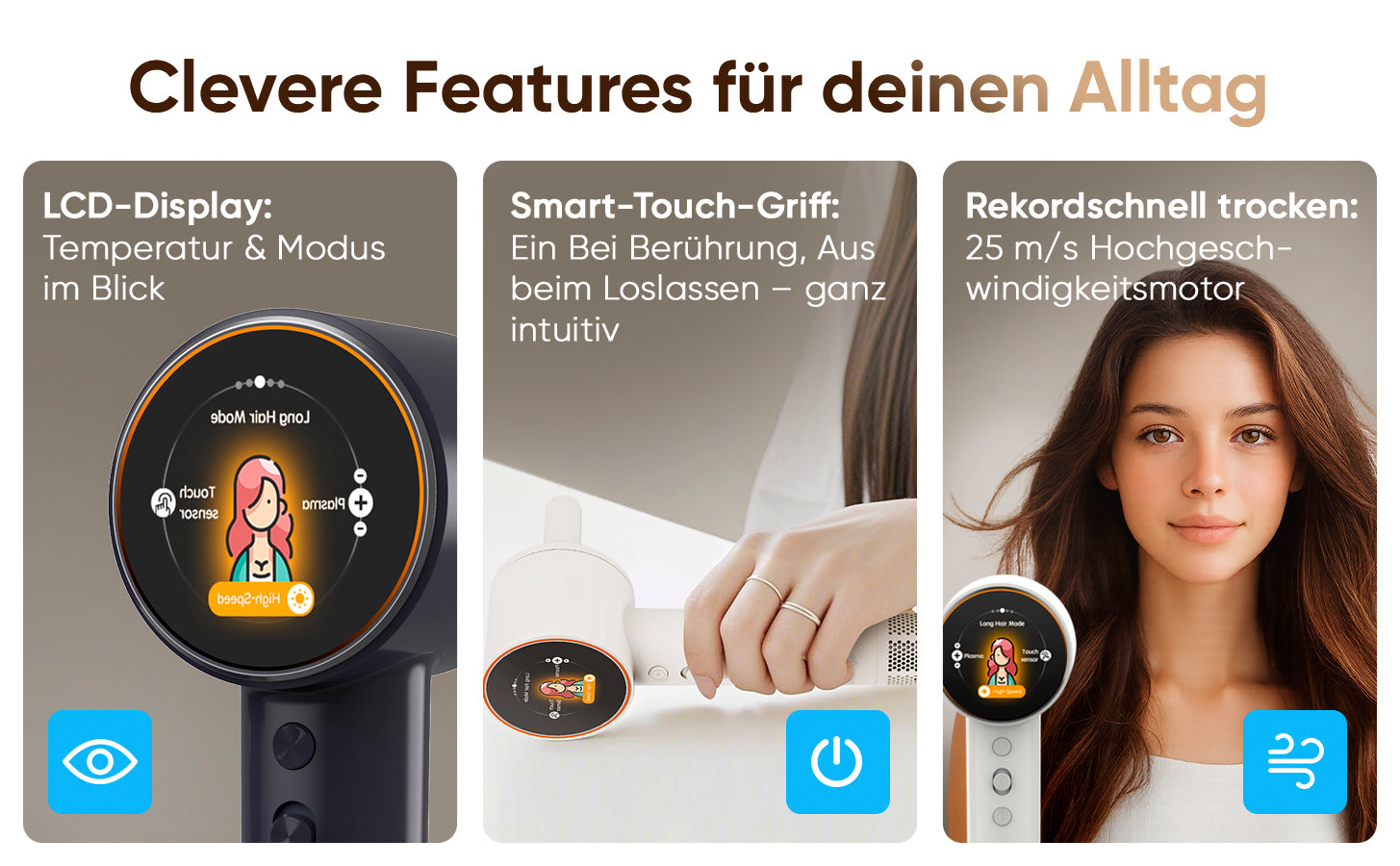 Erlebe die Zukunft: Der Smart-Touch-Griff aktiviert den Föhn nur bei Berührung. Das klare LCD-Display und der smarte Hitzeschutz sorgen dafür, dass dein Haar immer sicher und schonend gestylt wird.