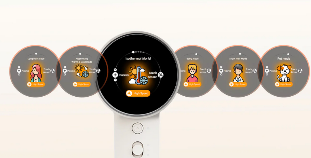 Mit 6 intelligenten Pflege-Modi passt sich der Föhn jedem Haartyp perfekt an – vom sanften Baby- und Haustier-Modus über Isotherm-Temperaturkontrolle bis hin zum Styling-Wechselmodus für langanhaltende Ergebnisse.